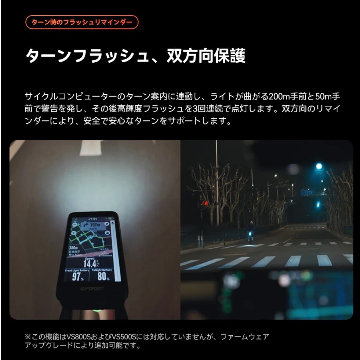 サイクルコンピューターのターン案内に連動し、曲がり角の200メートル手前と50メートル手前で警告。続けて高輝度の点滅が3回発生し、安全を促します。